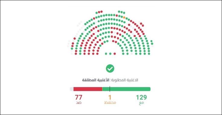 وقد توزعت الأصوات المانحة للثقة كالآتي: حركة النهضة بـ52 نائبا, وكتلة المستقبل ب8 نواب وكتلة الإصلاح ب15 نائبا وكتلة تحيا تونس ب13 نائبا , والكتلة الديمقراطية ب37 نائبا وأربع نواب من غير المنتمين .