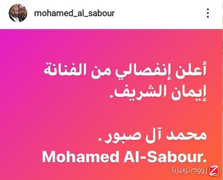 زووم - أعلن المصري محمّد آل صبور، مساء السبت، انفصاله عن زوجته الفنانة التونسيّة إيمان الشريف.
