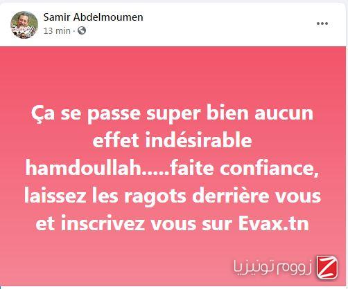 وأكّد عبد المؤمن ، في تدوينة على حسابه الشخصي بالفايسبوك"، أنّ الأمر رائع ولا يوجد أية اثار جانبيّة لحدّ اللحظة، داعيا المواطنين إلى التسجيل وعدم الخوف.