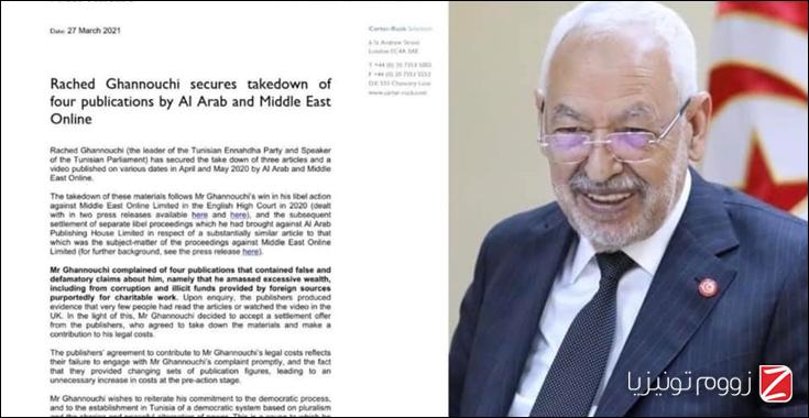 زووم - حصل راشد الغنوشي رئيس حركة النهضة ورئيس مجلس نواب الشعب على التزام بإزالة ثلاثة مقالات ومقطع فيديو نُشروا في تواريخ مختلفة في أفريل وماي 2020 من قبل جريدة "العرب" وموقع "ميدل إيست أونلاين".