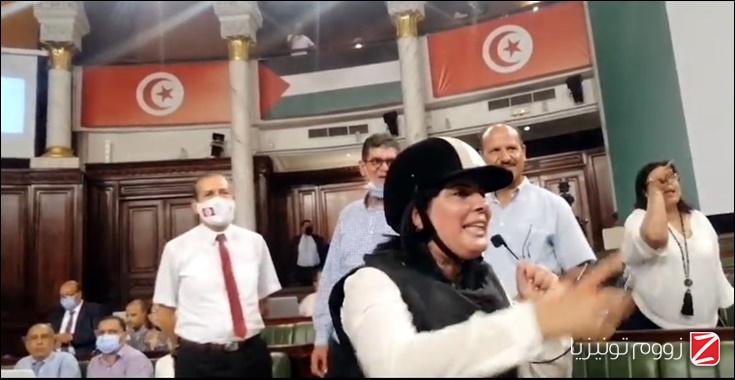 ورفعت عبير موسي مع نواب كتلتها هتافات متواصلة ومستمرة باستعمال مضخمات الصوت ورفع شعارات تطالب برحيل وزير الصناعة أثناء تلاوة مقرر اللجنة للتقرير المتعلق بمشروع قانون اتفاقية الخاصة بالبحث عن المحروفات المعروفة برخصة زارات.