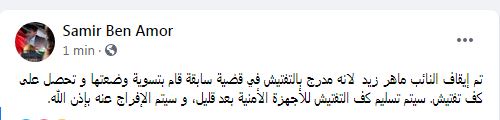زووم - قال المحامي سمير بن عمر، مساء الجمعة، أنّه قد تمّ إيقاف النائب ماهر زيد لأنّه مدرج بالتفتيش في قضية سابقة قام بتسوية وضعيتها وتحصّل على كف تفتيش.