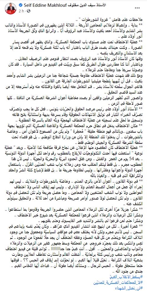 زووم - تحدث النائب والمحامي سيف الدين مخلوف، اليوم الأحد، عن الحادثة التي جدّت معه أمام المحكمة العسكرية، حيث أكّد أنّه كان مطاردا طوال الطريق وهو في اتجاهه إلى المحكمة.