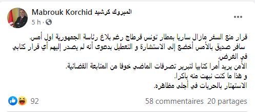 وأوضح كورشيد، في تدوينة له على "الفايسبوك"، أن صديق له سافر بالأمس وخضع إلى الاستشارة و التعطيل بدعوى أنه لم يصدر إليهم أي قرار كتابي في الغرض.