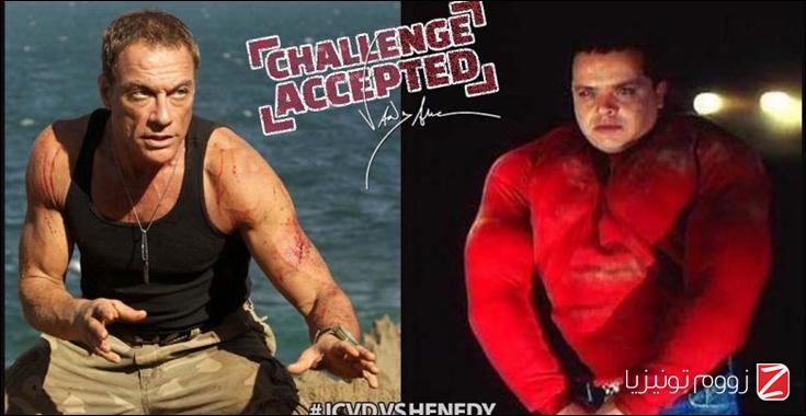 وكان محمد علّق على تدوينة جان كلود الساخرة التي أعلن فيها قبوله التحدي القتالي بينهما، فشارك جمهوره بصورته من فيلم "فول الصين العظيم" عبر فيسبوك وبجانبها صورة لـ جان كلود، معلقًا: " مازلت عند كلمتي .. مباراة بدون قوانين .. في قفص هيل ان سيل .. بشرط واحد .. ايدك الاتنين يبقوا مربوطين".
