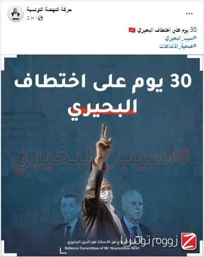 زووم - ذكّرت حركة النهضة، مساء اليوم السبت عبر نشر صورة على صفحتها الرسميّة على "الفايسبوك"، بأنّ نائبها القيادي نور الدين البحيري "مختطف لليوم الثلاثين".