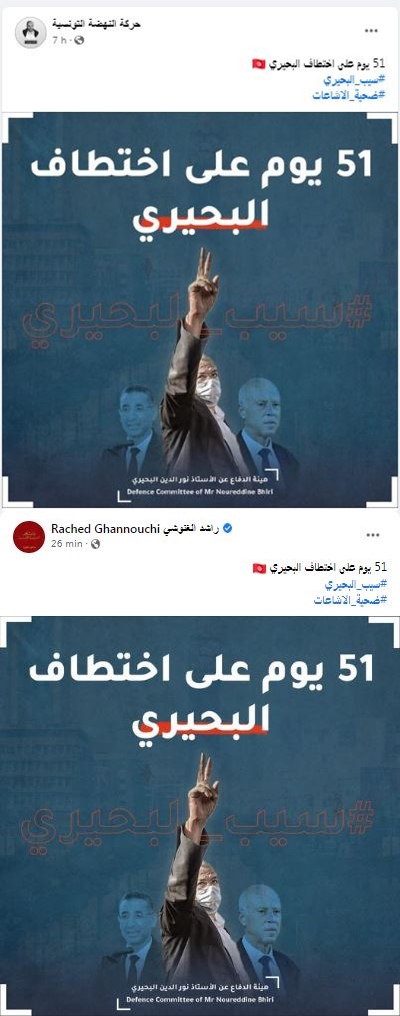 زووم - ذكّرت حركة النهضة، مساء اليوم السبت عبر نشر صورة على صفحتها الرسميّة على "الفايسبوك"، بأنّ نائبها القيادي نور الدين البحيري "مختطف لليوم الواحد والخمسون".