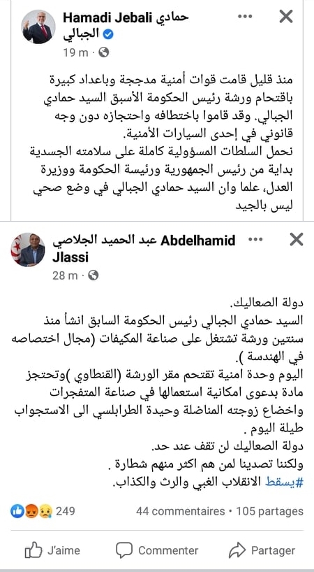 من جانبه، أكّد السياسي عبد الحميد الجلاصي أنّ الوحدة الأمنية اقتحمت مقر الورشة واحتجزت مادة بدعوى امكانية استعمالها في صناعة المتفجرات إضافة إلى اخضاع زوجته وحيدة الطرابلسي الى الاستجواب طيلة اليوم.