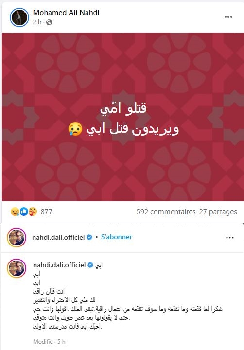 وقال النهدي "قتلو امّي ويريدون قتل ابي"، وتابع ابي، انت فنّان راقي، لك منّي كل الاحترام والتقدير، شكرا لما قدّمته وما تقدّمه وما سوف تقدّمه من اعمال راقية،تبقى الملك .اقولها وانت حي حتّى لا يقولونها بعد عمر طويل وانت متوفّي، احبّك ابي فانت مدرستي الاولى".