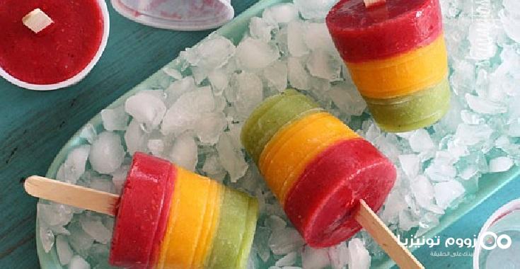 ملحوظة : عليك إضافة المانجو ووضعها فى الثلاجة لمدة 20 دقية ، ثم وضع التوت وغرس العصاة ووضعها فى الثلاجة لمدة 20 دقيقة اخرى ثم الكيوى ووضعه لبقية الساعة .