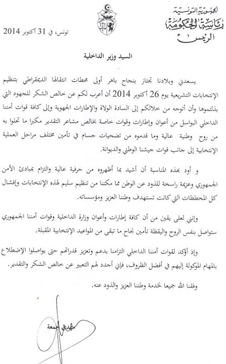 وأعرب رئيس الحكومة المؤقتة عن يقينه من أن كافة إطارات وأعوان وزارة الدّاخلية وقوات الأمن الجمهوري ستواصل بنفس الروح واليقظة تأمين نجاح ما تبقى من المواعيد الانتخابية المقبلة.