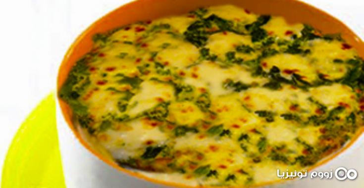 - نضع الطبق في الفرن حتى يتماسك قليلا ثم نقدمه.