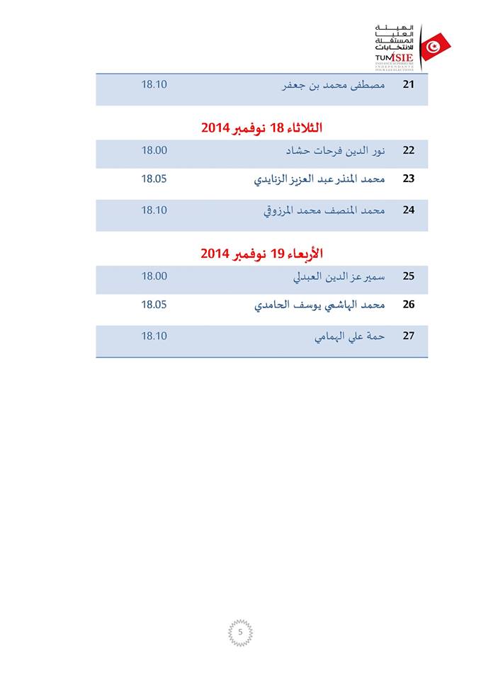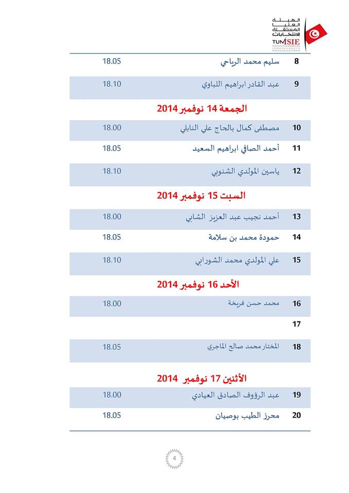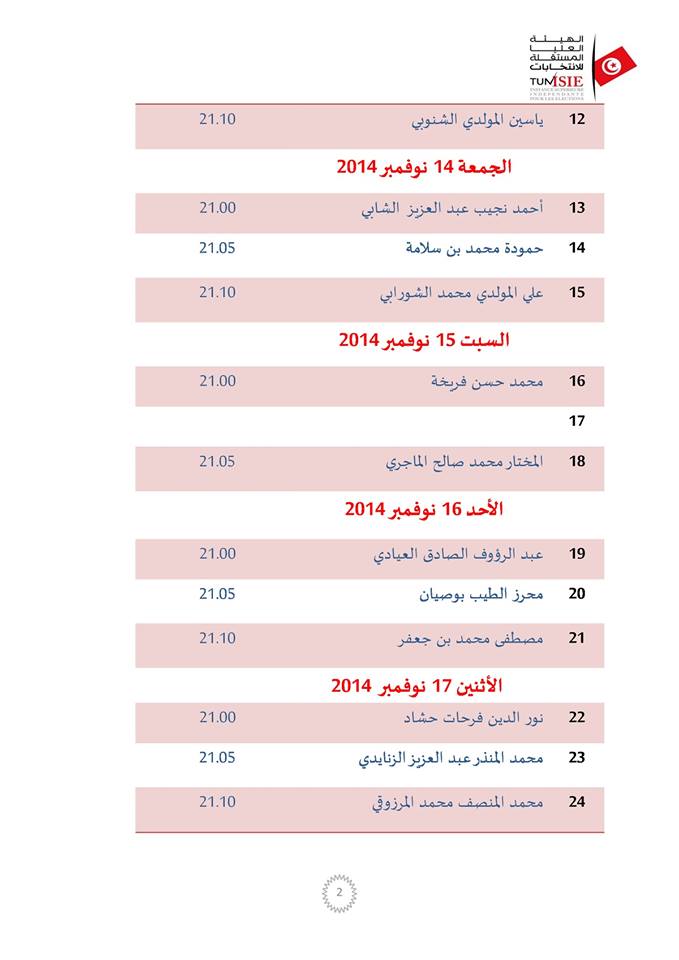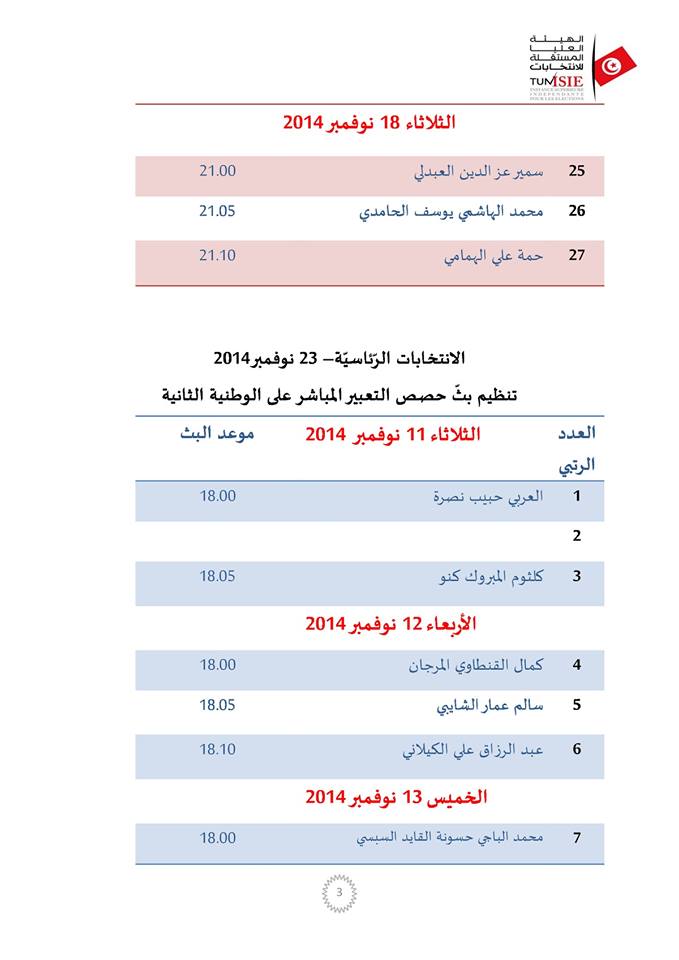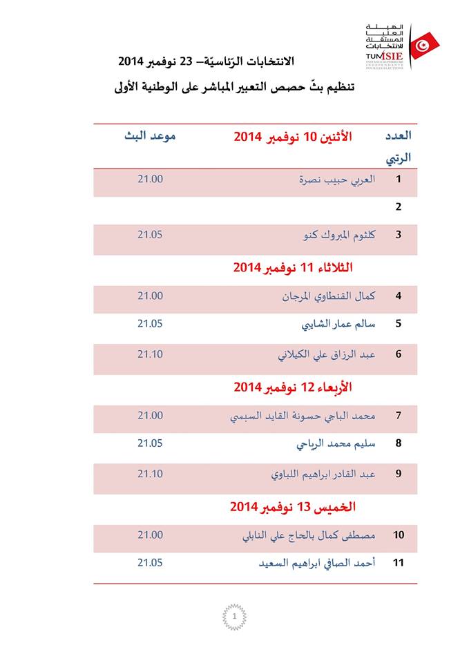 نشرت الهيئة العليا المستقلة للانتخابات، اليوم السبت 08 نوفمبر 2014، على صفحتها الرسمية على موقع التواصل الإجتماعي فايسبوك، توقيت بثّ حصص التّعبير المباشر للمترشّحين للانتخابات الرّئاسيّة.