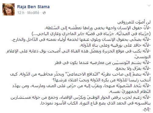 وها هي اليوم تقدّم أسبابها الشخصية لذلك، في تدوينة على حسابها الخاص على الفايسبوك في محاولة لشيطنته وإخراجه في ثوب اللاحقوقي المتعطش للسلطة واللاهث وراء الكراسي.