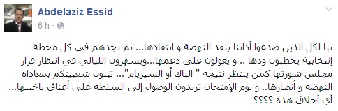 واعتبر الصيد أنّ هؤلاء "يبنون شعبيتهم بمعاداة النهضة و أنصارها و يوم الإمتحان تريدون الوصول إلى السلطة على أعناق ناخبيها".