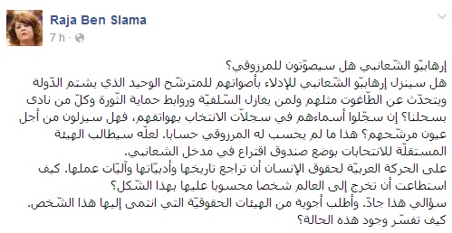 قالت الأستاذة الجامعية رجاء بن سلامة انّ إرهابيي الشعانبي سينزلون "للإدلاء بأصواتهم للمترشّح الوحيد الذي يشتم الدّولة ويتحدّث عن الطّاغوت مثلهم ولمن يغازل السّلفيّة وروابط حماية الثّورة وكلّ من نادى بسحلنا"، في إشارة منها للدكتور المنصف المرزوقي.