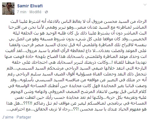 وأكّد الوافي، في تدوينة له على الفايسبوك، أنّ محسن مرزوق هو من اتّصل به بنفسه لاقتراح تلك المناظرة وأعلمه بقبوله التحدي واتّصل بعدنان منصر، ولم يشترط عليه البث المباشر لمناظرته مع منصر كما ادّعى، معتبرا ذلك تبريرا وهميا لأنّ الفريق هو من اقترح عليه البث المباشر، حسب قوله، "بل كان طلبه الوحيد هو بث الحلقة ليلة الخميس وقد كان موافقا على كل شيء بدون شروط مسبقة".