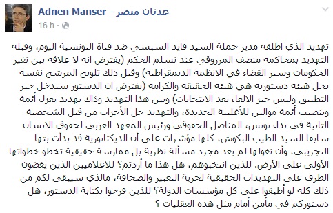 وأوضح منصر، في تدوينة له على الفايسبوك، أنّ مدير الحملة الانتخابية للسبسي سبق وأن هدّد بمحاكمة المرزوقي عند تسلم الحكم، كما هدّد بعزل الأئمة وتنصيب أئمة موالين للأغلبية الجديدة، إلى جانب تلويح السبسي نفسه بحل هيئة دستورية هي هيئة الحقيقة والكرامة.
