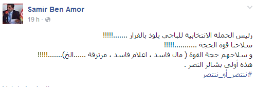 كما انتقد القيادي بالمؤتمر انسحاب محسن مرزوق من المناظرة مع عدنان منصر قائلا : "رئيس الحملة الانتخابية للسبسي يلوذ بالفرار"، مؤكدا أنّ سلاحهم لا يتعدّى أن يكون مالا فاسدا، إعلاما فاسدا مرتزقة، معتبرا هذا الإنسحاب "أولى بشائر النصر".