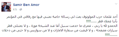 وأكّد بن عمر تلقّيه رسالة خاصة من أحد من وصفهم بـ "غلمان حزب المولوتوف" نعته فيها مع رفاقه في المؤتمر بأنّهم عملاء قطر، موضّحا أنّه لم يتلقّ سيارات مصفّحة من قطر ولم يقبض أموالا من ساويريس ولا حتى من دحلان، حسب تعبيره، حتّى يتمّ توجيه مثل هذه الإتّهامات له.