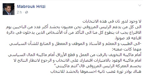 وتوجه القيادي بحزب المؤتمر بنداء إلى كل المتابعين للشأن السياسي مهما كانت صفتهم، لعدم الإقتصار على الانتخاب والرجوع لانتظار النتائج فهو لا يحسم المعركة أمام ماكينة التخويف، مذكرا بقول المنصف المرزوقي : "أنتم ماكينتي".