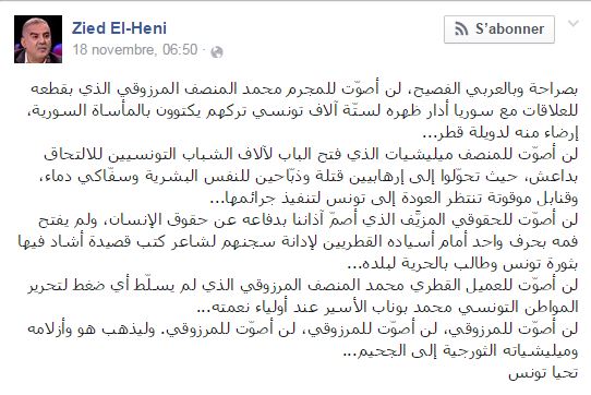 وأشار زياد الهاني أنّ المرزوقي فتح الباب لآلاف الشباب التونسيين للالتحاق بداعش، حيث تحوّلوا إلى إرهابيين قتلة وذبّاحين للنفس البشرية وسفّاكي دماء، وقنابل موقوتة تنتظر العودة إلى تونس لتنفيذ جرائمها.