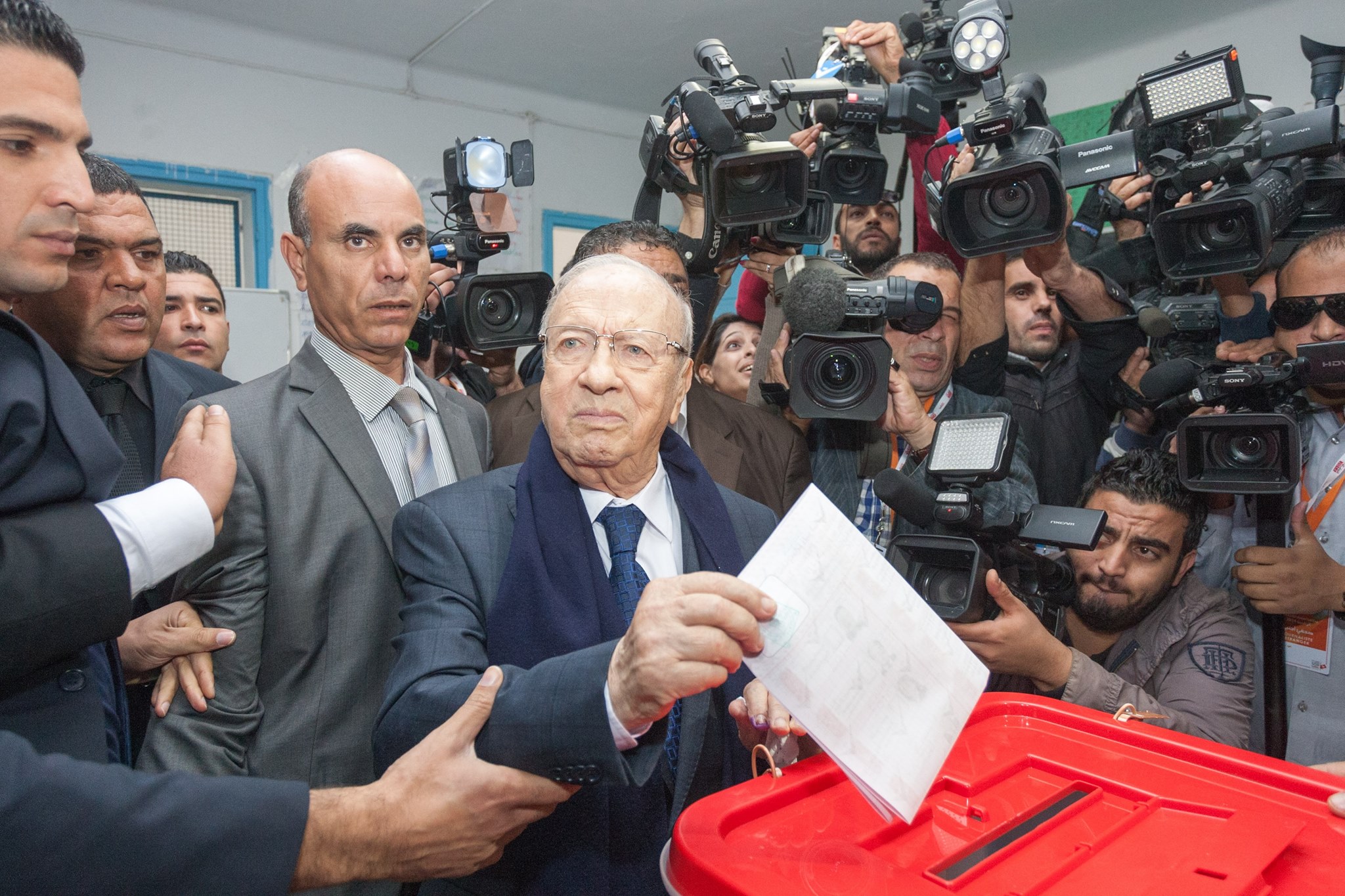 تداول نشطاء على مواقع التواصل الإجتماعي صورة للباجي قائد السبسي وهو يضع الورقة الإنتخابية في الصندوق الإنتخابي و يساعده في رفع يده المرافق الأمني.