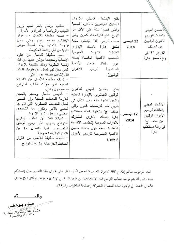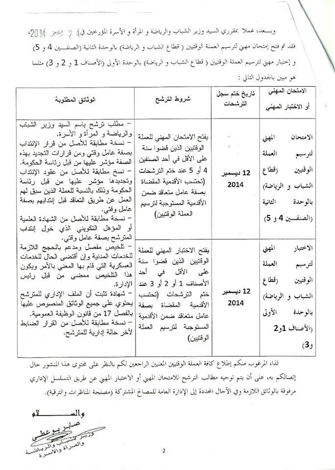 تفتح وزارة الشباب والرياضة والمرأة والأسرة امتحان مهني لترسيم العملة الوقتيين في قطاعي الشباب والرياضة بالوحدة الثانية (الصنفين 4و5)واختبار مهني لترسيم العملة الوقتيين في نفس القطاعين بالوحدة الاولى (الاصناف1و2و3)