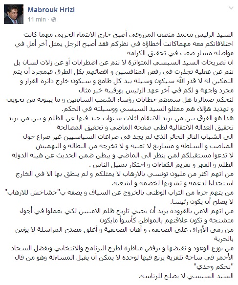وأكّد الحريزي، في تدوينة له على الفايسبوك، أنّ السبسي في حال فوزه لن يكون إلاّ "وسيلة بيد كل طامع و سيكون خارج دائرة القرار و مجرد واجهة و لكم في آخر عهد الرئيس بورقيبة خير مثال"، حسب قوله.