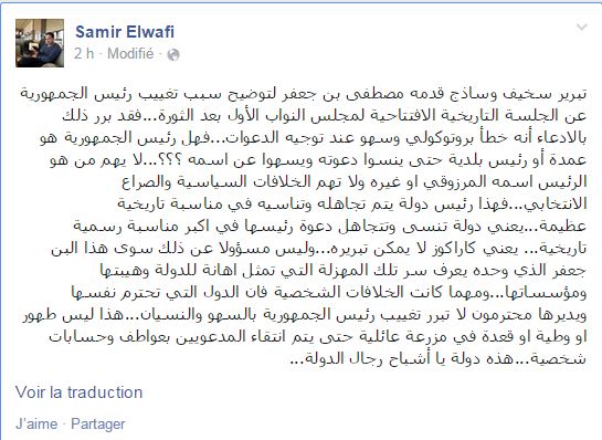 وأشار سمير الوافي إلى أنّ تجاهل وتناسي رئيس الدولة في مناسبة تاريخية يعني تناسي وتجاهل الدولة، مؤكداً أنّ بن جعفر هو المسؤول عن ذلك وهو الوحيد الذي يعرف سر تلك المهزلة التي تمثل اهانة للدولة وهيبتها ومؤسساتها.