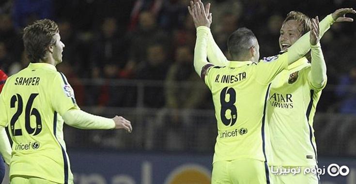 حصل برشلونة على دفعة معنوية كبيرة بعودة صانع اللعب الخطير اندريس انيستا من الاصابة قبل مباراته على أرضه أمام غريمه في المدينة اسبانيول بدوري الدرجة الأولى الاسباني لكرة القدم يوم الاحد. اكتسح نادي برشلونة، يوم الأربعاء، مضيفه هويسكا، برباعية نظيفة في ذهاب دور الـ 32 لبطولة كأس ملك إسبانيا لكرة القدم. وسجل رباعية برشلونة، الكرواتي ايفان راكيتش، والثنائي الإسباني أندريس إنييستا، وبيدرو رودريغيز، والبرازيلي رافينيا الكانتارا في الدقائق 12 و15 و38 و71. وخاض الفريق الكتالوني اللقاء في غياب ثلاثة من أوراقه الهجومية المتمثلة في الأرجنتيني ليونيل ميسي، والبرازيلي نيمار دا سيلفا، والأورغوياني لويس سواريز لوجهة نظر فنية. وبذلك، اقترب نادي برشلونة من التأهل إلى دور الـ 16، حيث أصبح يكفيه التعادل أو الفوز بأي نتيجة، أو الهزيمة بأقل من أربعة أهداف في لقاء الإياب الذي سيقام يوم 18 من الشهر الجاري. بينما يحتاج هويسكا إلى الفوز بأكثر من خمسة أهداف لانتزاع بطاقة التأهل من الفريق الكتالوني. وفي مباراة ثانية، فاز غرناطة على ضيفه قرطبة بهدف دون رد، سجله الكولومبي جون كوردوبا في الدقيقة 25. وبذلك، أصبح نادي غرناطة التعادل أو الفوز بأي نتيجة في لقاء الإياب الذي سيقام الأسبوع المقبل للتأهل. بينما سيكون قرطبة مطالبا بالفوز بأكثر من هدف لانتزاع بطاقة التأهل إلى دور الـ 16