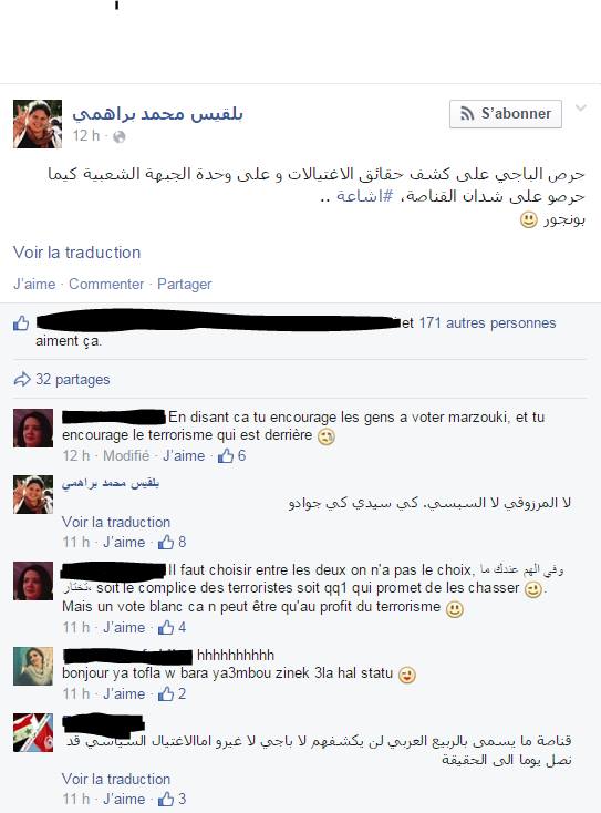 وكتبت بلقيس البراهمي، صبيحة اليوم الاربعاء 10 ديسمبر 2014، أنّ حرّض مرشح نداء تونس، الباجي قائد السبسي، على كشف حقائق الإغتيالات وعلى وحدة الجبهة الشعبية كحرصه على القبض على القناصة إشاعة لا غير.