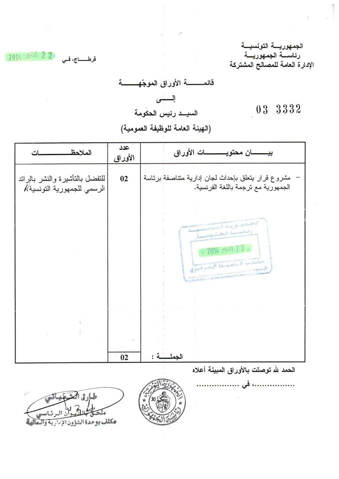وأوضحت الرئاسة في بلاغ لها أن القرار "لا ينطوي على أي خرق للقانون خلافا لما تم ترويجه بإحدى الإذاعات الخاصة ، إذ أن هذا القرار تم إمضاؤه من قبل السيد عدنان منصر، الوزير مدير الديوان الرئاسي، وإرساله يوم 22 أكتوبر 2014 إلى رئاسة الحكومة ليتولى السيد رئيس الحكومة التأشير عليه والإذن بنشره، أي أن السيد عدنان منصر أمضى على هذا القرار قبل استقالته التي أصبحت نافذة بداية من غرة نوفمبر 2014 وان التاريخ المذكور بالرائد الرسمي هو تاريخ تأشير السيد رئيس الحكومة على القرار المذكور مثلما جرى به العمل".