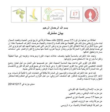 و تم التأكيد في هذا البيان عن أن الثورة التونسية شكلت محطة فارقة في تاريخ تونس الحديث وفتحت المجال لبناء مشروع وطني بديل قائم على القطيعة مع المنظومة السابقة.