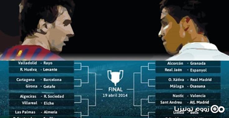 أظهرت قرعة كأس ملك إسبانيا لموسم 14-2013 أن الغريمين ريال مدريد وبرشلونة لن يتقابلا إلا في نهائي البطولة . كما تأهلت أندية إسبانيول، وخيتافي، و ليفانتي،يوم الأربعاء، إلى دور الـ 16 من بطولة كأس ملك إسبانيا لكرة القدم. وتغلب إسبانيول على ضيفه ديبورتيفو ألافيس بهدف دون رد في إياب دور الـ 32 للمسابقة. وسجل هدف الفوز، جيرو موريلا في الدقيقة 65. وجاء تأهل إسبانيول إلى دور الـ 16 بإجمالي نتيجة مباراتي الذهاب والإياب، حيث انتهت مباراة الذهاب بفوز إسبانيول بهدفين دون رد. وفي مباراة ثانية، تغلب خيتافي على مضيفه إيبار بهدفين لهدف. وسجل هدفي خيتافي، كارلوس فيجاري، و دييغو كاسترو في الدقيقتين 19 و33، بينما أحرز هدف إيبار، فيديريكو باوفاكاري في الدقيقة 55. وجاء تأهل خيتافي إلى دور الـ 16 بإجمالي نتيجة مباراتي الذهاب والإياب، حيث انتهت مباراة الذهاب بفوز خيتافي بثلاثية نظيفة. وفي مباراة ثالثة، تعادل ليفانتي مع ضيفه الباسيتي سلبيا، ليتأهل الأول بإجمالي نتيجة مباراتي الذهاب والإياب، حيث انتهت مباراة الذهاب على ملعب الباسيتي بالتعادل الإيجابي بهدف لكل منهما. ووفقا للوائح الاتحاد الدولي لكرة القدم (فيفا)، فإنه يتم احتساب الهدف بهدفين لأي فريق يلعب خارج ملعبه.
