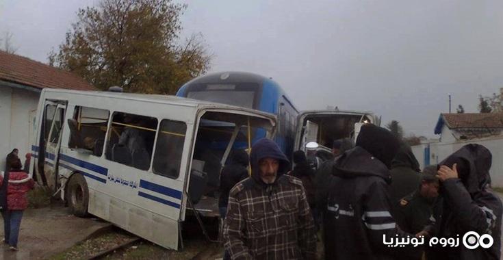 جد صباح اليوم الخميس 18 -12-2014 حادث اصطدام حافلة ركاب من نوع زينة وعزيزة تابعة للشركة الجهوية للنقل ببنزرت بقطار بنزرت –تونس على مستوى الحاجز الالي للسكة الحديدية بالمصيدة من معتمدية بنزرت الجنوبية .