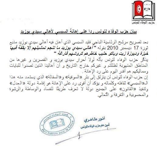 وأضاف البيان أنّ حزب الوفاء لتونس لن ينزلق إلى بئر السوقية والسفالة الذي يستمد منه هذا السبسي ثقافته وكلماته و يؤكد أن أقوى رد على الإهانة هو إقامة دولة العدل وتنفيذ القانون على الجميع .