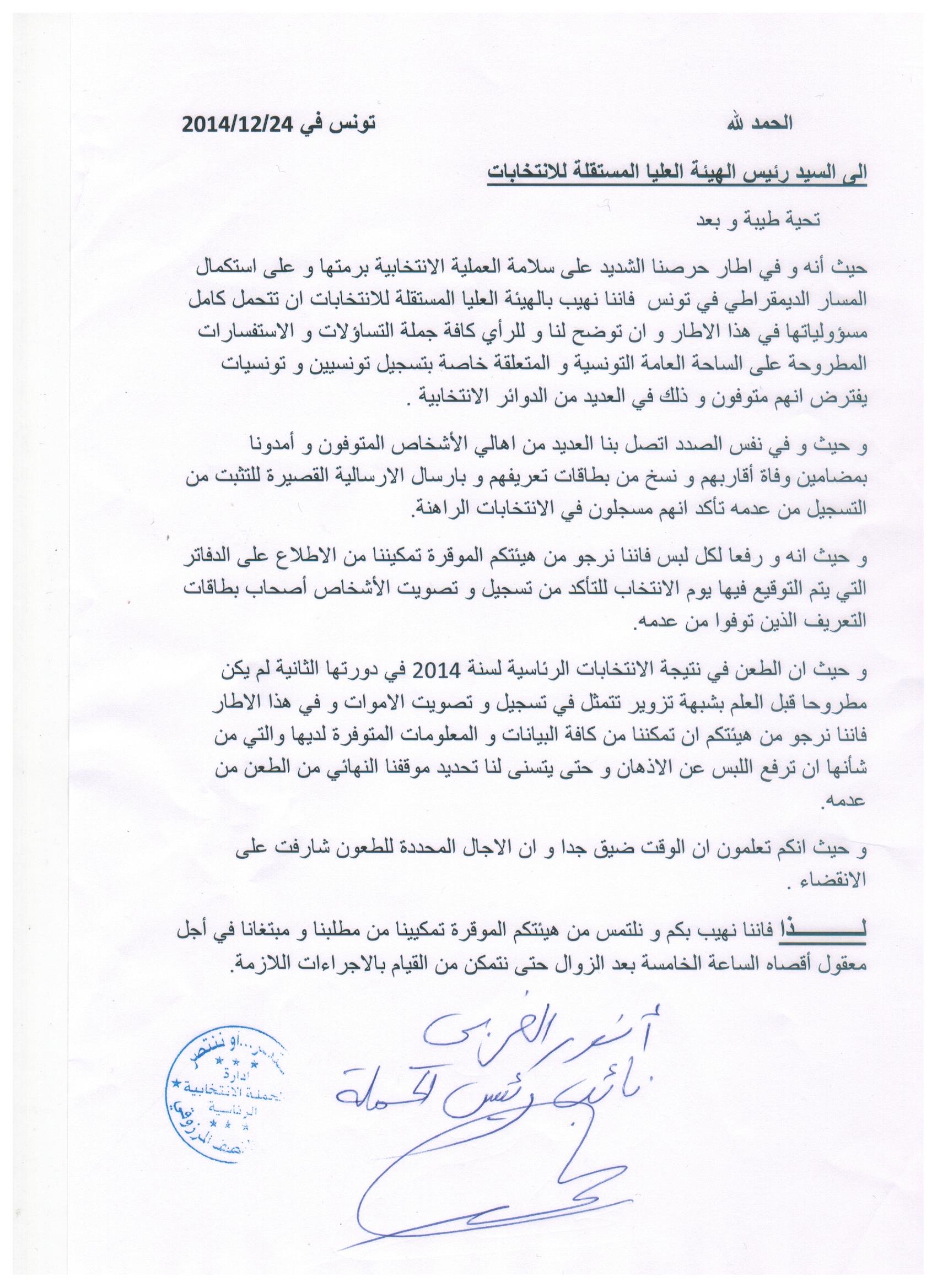 حيث جاء في نص الرسالة أنه على الهيئة تقديم تفسير ما كان بخصوص وجود مواطنين متوفيين بالسجل الانتخابي كما طالبت إدارة الحملة أيضا تمكينها من الإطلاع على السجل الانتخابي الذي تم التوقيع فيها يوم الانتخابات للتثبت فيها .