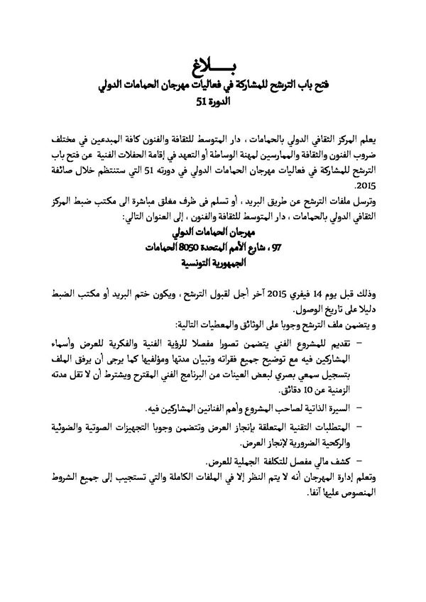 وترسل ملفات الترشح عن طريق البريد أو تسلم في ظرف مغلق مباشرة إلى مكتب ضبط المركز الثقافي الدولي بالحمامات، دار المتوسط للثقافة والفنون، إلى العنوان التالي :
