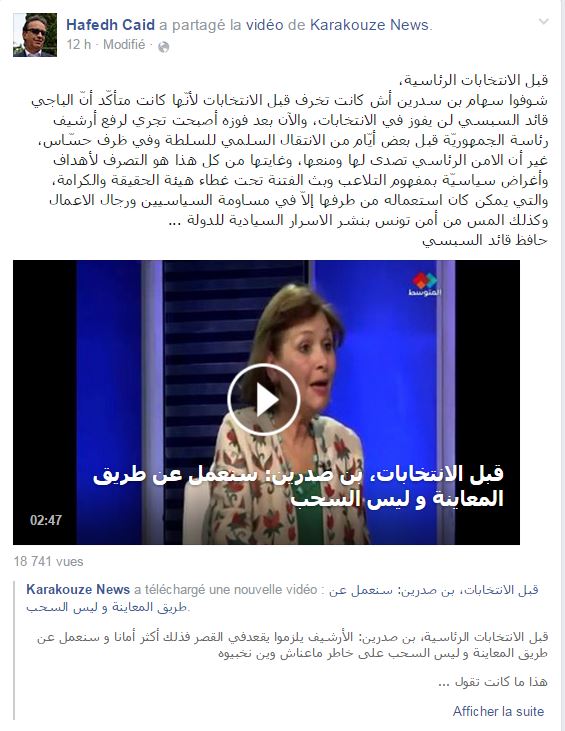وأضاف السبسي، في تدوينة له على حسابه الخاص على الفايسبوك، أنّ بن سدرين سارعت بنقل الأرشيف بعد فوز والده وققبل بعض أيّام من الانتقال الديمقراطي، مؤكداً أنّ غايتها من كل هذا هو التصرف لأهداف وأغراض سياسيّة بمفهوم التلاعب.