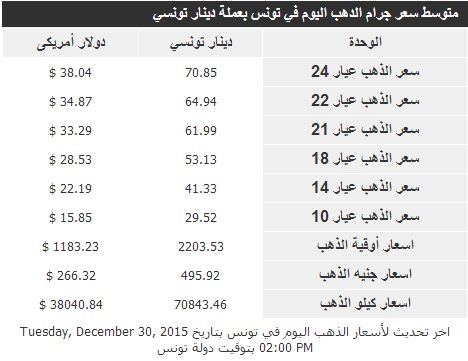 وفي ما يلي أسعار الذهب بالدينار التونسي وبالدولار حسب العيار :
