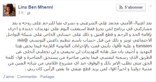 وأفادت بن مهني، في تدوينة لها على الفايسبوك، أنّها تلقت هذا التهديد عبر حسابها الخاص على تويتر من قِبل حساب يحمل إسم تنظيم داعش التونسي.