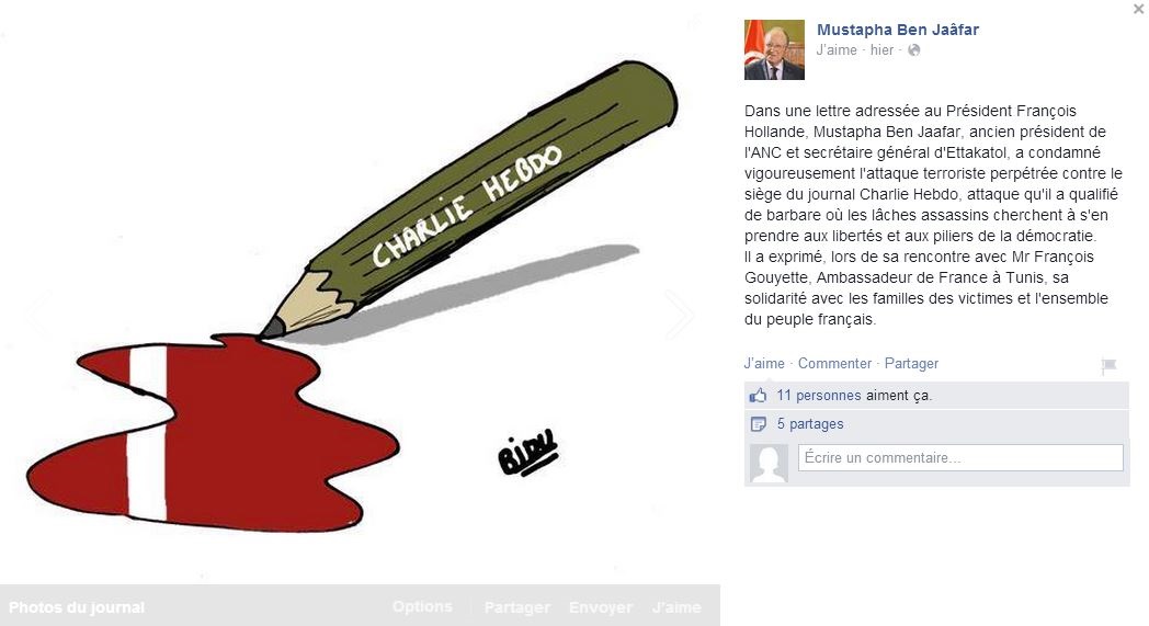 وقد أدان بن جعفر في رسالته بشدة الهجوم الإرهابي الذي نفّذته مجموعة مسلحة على مقر صحيفة "شارلي إبدو" والذي وثفه بالهجوم "الهمجي" والساعين بالأساس إلى ضرب الحريات ودعائم الديمقراطية.
