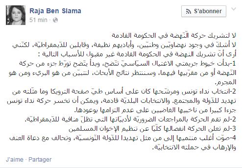 وقالت رجاء بن سلامة، في تدوينة على حسابها الخاص على الفايسبوك، أنّه ليست مع تشريك النهضة وذلك رغن أنها لا تشك في وجود نهضاويّين وطنيّين، وأياديهم نظيفة، وقابلين للدّيمقراطيّة وفق تعبيرها.