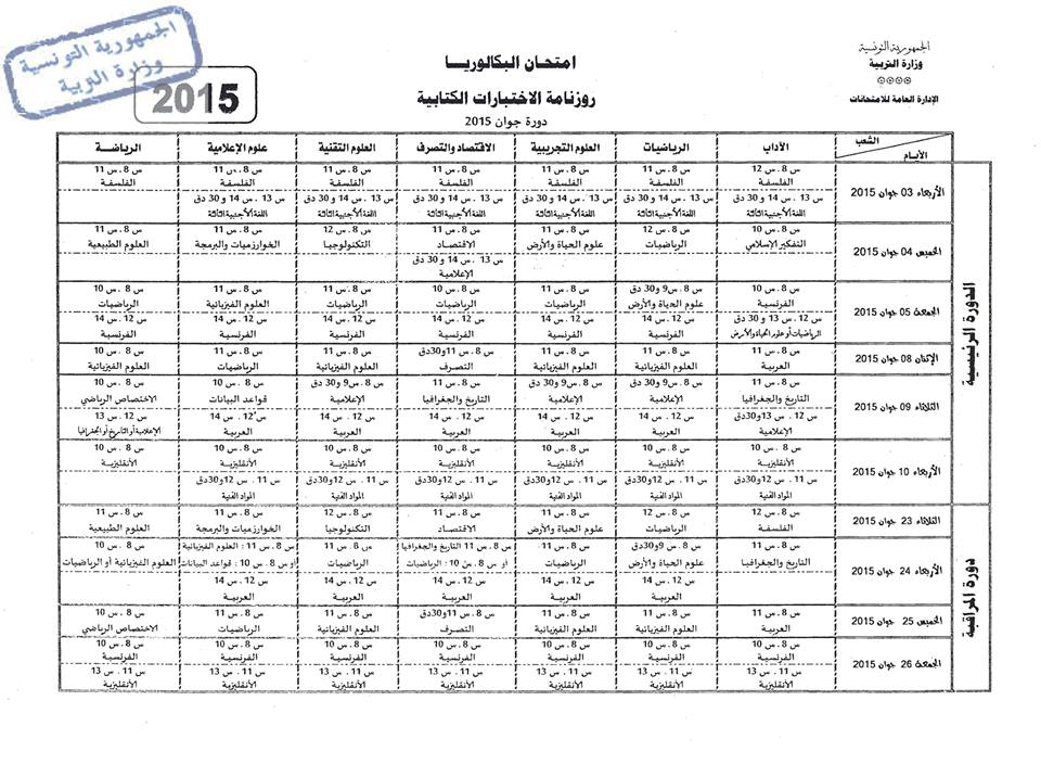 نشرت وزارة التربية، اليوم الخميس 15 جانفي 2015، روزنامة الاختبارات الكتابية لامتحان البكالوريا دورة جوان 2015.