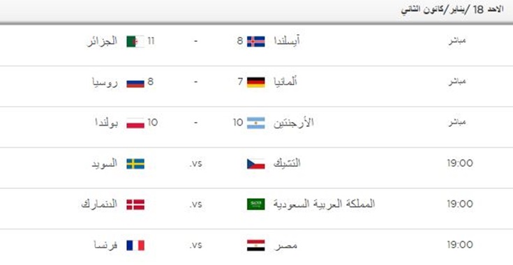 نتائج ومواعيد المباريات, اليوم الاحد, لكرة اليد رجال في الدور الثمن نهائي
