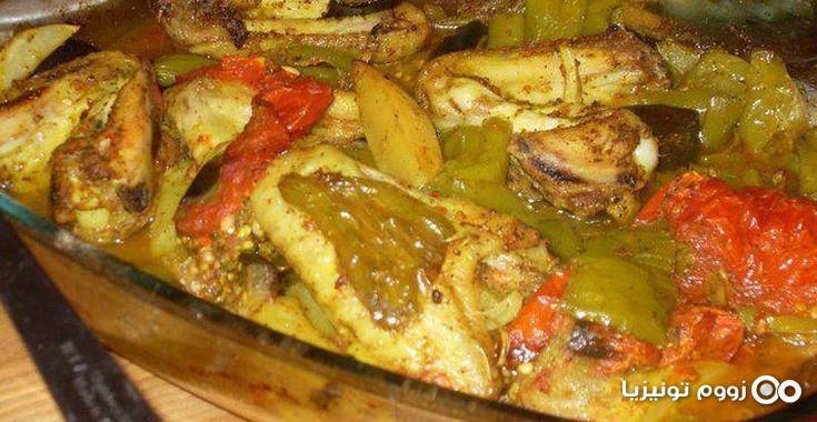 تدهن الدجاجة بالفرشاة بالزبدة على الوجه ثم تحاط بالبطاطا و الطماطم و الفلفل و البصل ثم تلف جيدا بورق الالومنيوم.