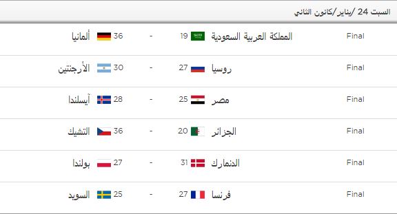 نتائج مباريات بطولة العالم لكرة اليد ليوم السبت ومواعيد مباريات غدا الاحد 25 جاتفي