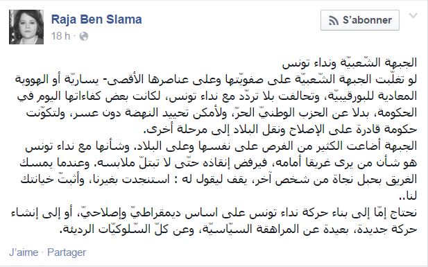 وأضافت رجاء بن سلامة أنّ تحالف الجبهة الشعبية مع نداء تونس يجعل من تحييد النهضة أمراً مُمكناً دون عسر، مؤكدة أنّ الجبهة أضاعت فرصاً كثيرة على نفسها وعلى البلاد وفق تعبيرها.