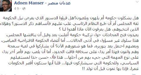 وتساءل منصر، في تدوينة له على الفايسبوك، عن هل أنّهم يُشكلون حكومة أم يلهون ويلعبون، مُشيراً إلى أنّ إعادة فتح المشاورات حول تركيبة أُعلِنت ولم يُناقشها المجلس سلوك غير مسؤول.